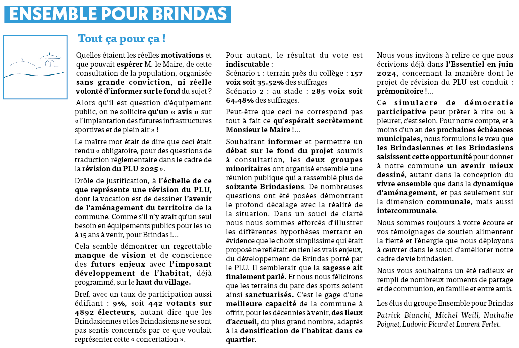 Vous trouverez ci-dessous la tribune de Ensemble pour Brindas de mars 2025.